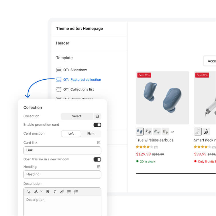 Customize layouts content and styles directly in the Shopify theme editor with no coding required.